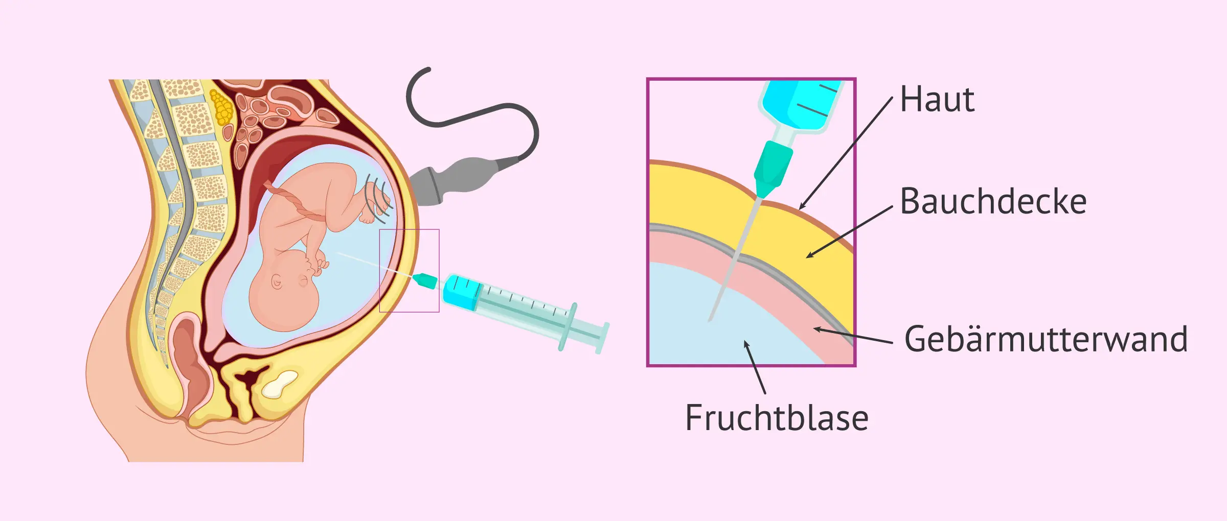 Die Untersuchung selbst dauert nur wenige Minuten. Unter Ultraschallkontrolle sticht der Arzt mit einer dünnen Kanüle die Bauchdecke und saugt einige Milliliter Fruchtwasser ab. Die entnommenen Zellen werden im Labor vermehrt und die Chromosomen auf Anzahl und Struktur hin untersucht.