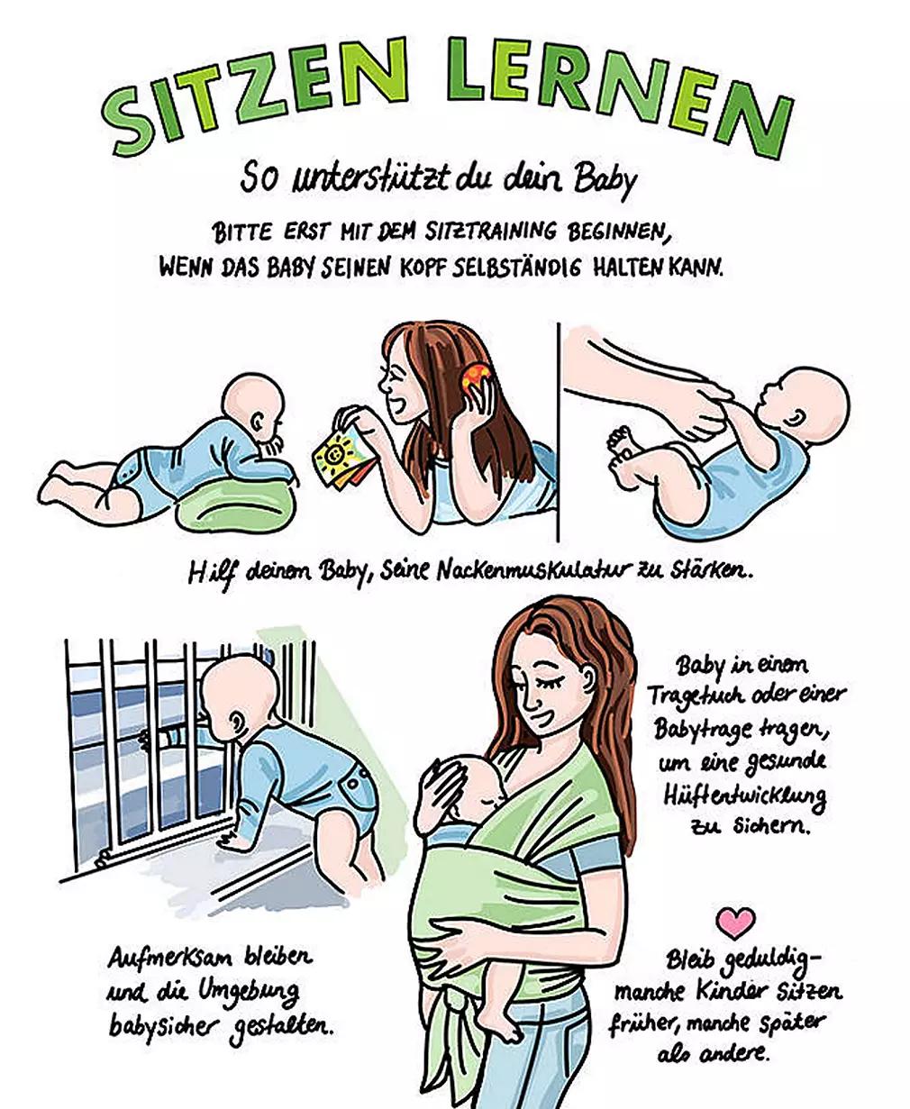 Ihr Kinderarzt kann Ihnen weitere Tipps geben, wie Sie Ihrem Baby beim Sitzenlernen helfen können. Er kann auch feststellen, ob Ihr Baby eine Physiotherapie benötigt. In den meisten Fällen ist eine Physiotherapie jedoch nicht notwendig.