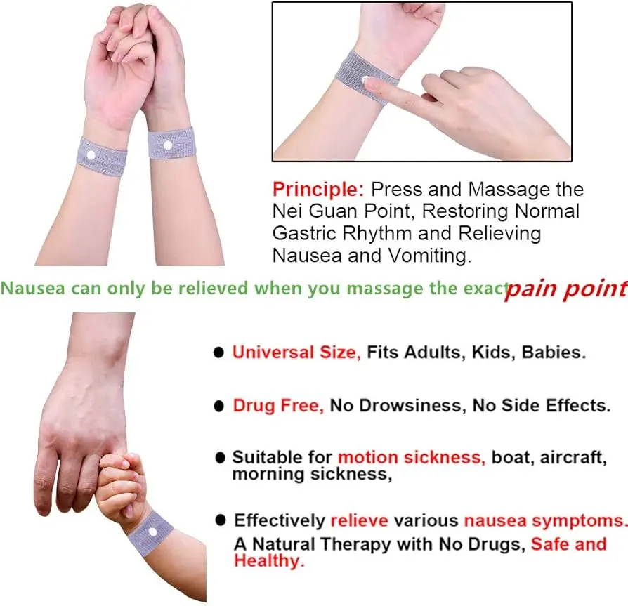 Das Akupressur-Armband, auch bekannt als Sea-Band, basiert auf der traditionellen chinesischen Medizin. Es wirkt durch die Stimulation des Nei-Kuan-Punktes, der sich am Handgelenk befindet. Dieser Punkt ist mit dem Magen und dem Verdauungstrakt verbunden. Durch den Druck des Armbands auf den Nei-Kuan-Punkt wird die Übelkeit und das Erbrechen reduziert.