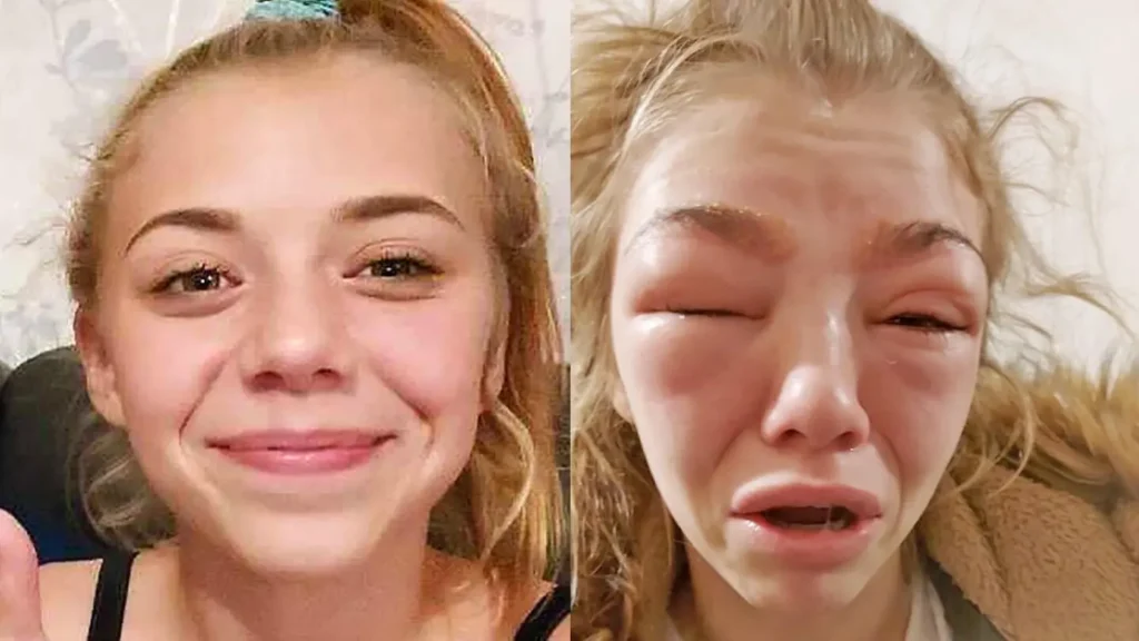 - Schwellung : Das Gesicht, insbesondere die Lippen, die Augenlider und die Zunge, können anschwellen.