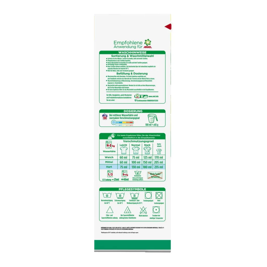 Die Dosierempfehlung finden Sie auf der Verpackung Ihres Ariel Pulverwaschmittels. Verwenden Sie die beiliegende Messlöffel, um die richtige Menge abzumessen. Die Dosierempfehlung kann je nach Waschmaschine und Wasserhärte variieren.
