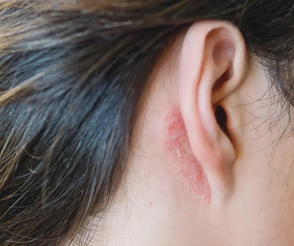 Psoriasis ist eine Autoimmunerkrankung, die zu roten, schuppigen Flecken auf der Haut führt. Sie kann an verschiedenen Körperstellen auftreten, einschließlich hinter den Ohren.