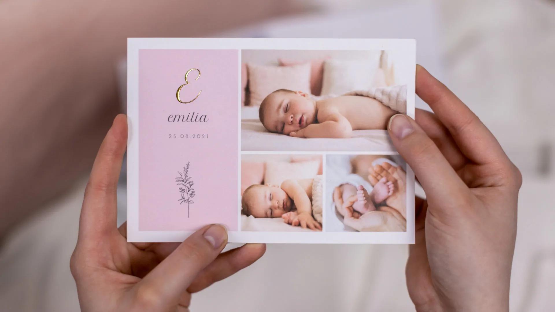 • Postkarten: Moderne Postkarten setzen das Lieblingsfoto des Babys in den Mittelpunkt und bieten einen minimalistischen Look.