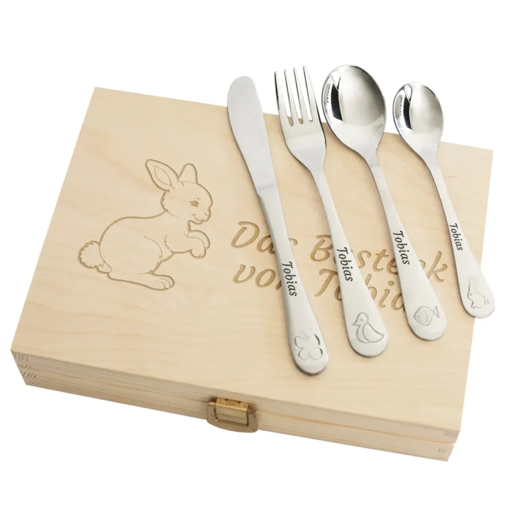 - Persönliche Gravur: Ein besonderes Highlight ist die Möglichkeit, das Besteck mit dem Namen des Kindes, dem Geburtsdatum oder einem anderen persönlichen Spruch zu gravieren. So wird das Geschenk zu einem einzigartigen Erinnerungsstück, das die Eltern und das Kind über viele Jahre hinweg begleiten wird.