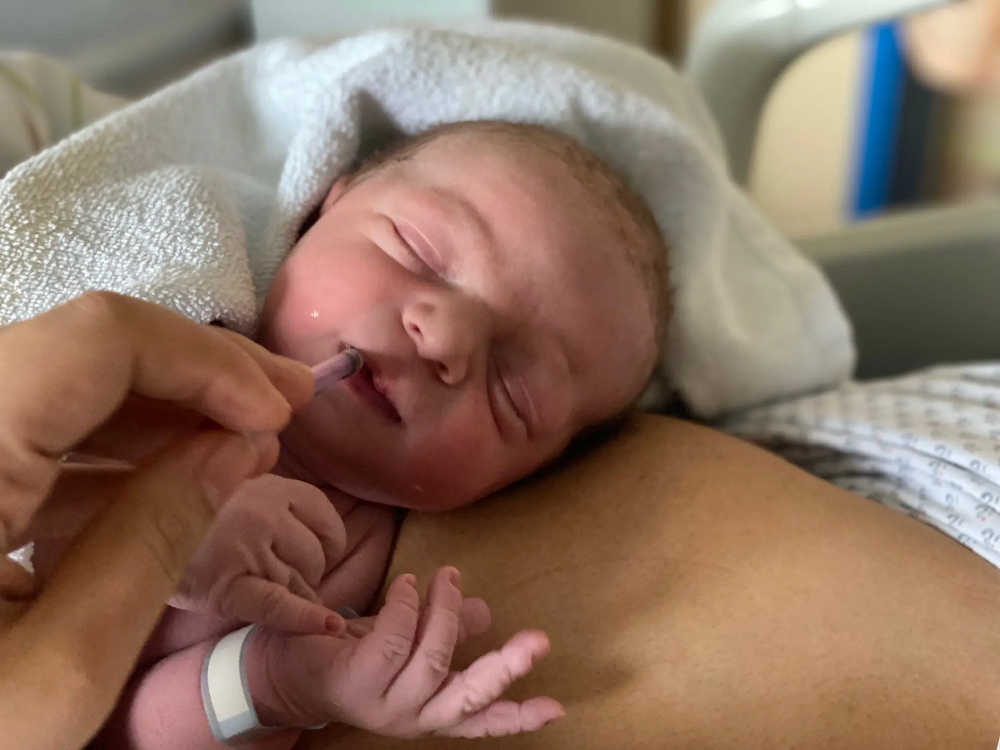 Im Kreißsaal kann das Kolostrum Ihrem Baby direkt nach der Geburt gegeben werden, entweder durch Stillen oder durch eine Spritze. Wenn Ihr Baby nicht sofort gestillt werden kann, kann das Kolostrum in einer Spritze aufbewahrt und später verabreicht werden.