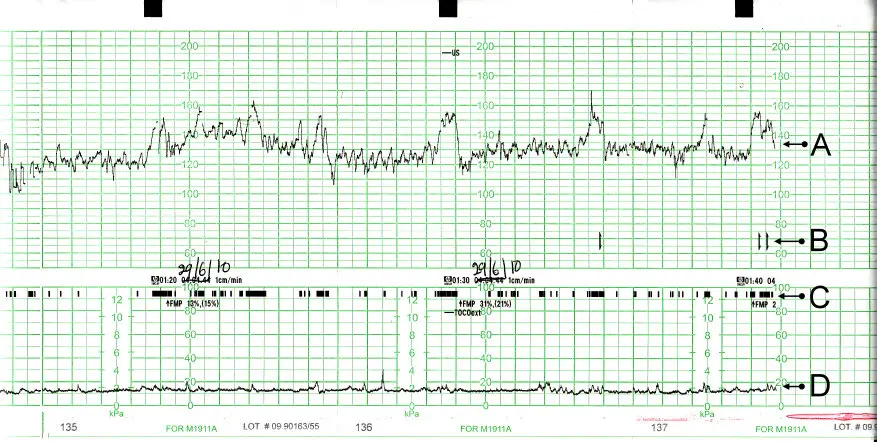 Die Daten, die von den Sensoren aufgezeichnet werden, werden auf einem Papierstreifen oder einem Bildschirm angezeigt. Die obere Kurve auf dem Papierstreifen zeigt die Herzfrequenz Ihres Babys, während die untere Kurve die Wehentätigkeit darstellt.