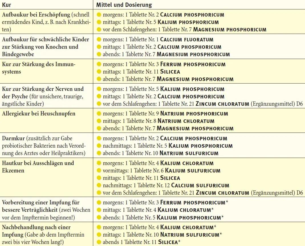 Hier sind einige Beispiele für die Dosierung von Schüßler-Salzen, die jedoch nur als Richtwerte dienen und nicht als allgemeingültige Empfehlungen verstanden werden sollen: