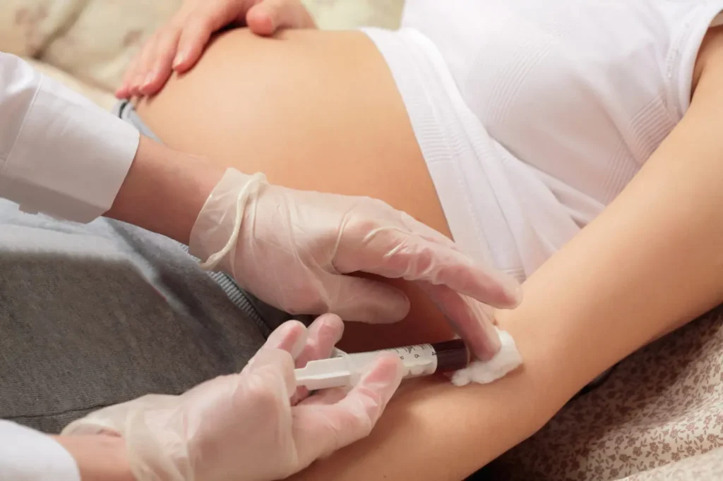 - Blutentnahme: Die Blutprobe der werdenden Mutter wird auf bestimmte Hormone untersucht, die auf eine Trisomie 21 hindeuten können.