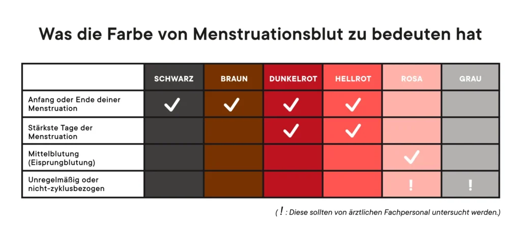 Die Farbe der Menstruationsblutung hängt von der Menge an Hämoglobin ab, einem eisenhaltigen Protein in den roten Blutkörperchen. Wenn die Blutung stärker ist, ist die Farbe rot. Wenn die Blutung schwächer ist, kann die Farbe bräunlich sein, da das Hämoglobin länger im Körper verbleibt und sich zersetzt.