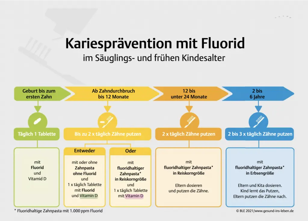 - Bis zum Lebensmonat: Keine Fluorid-Supplemente.