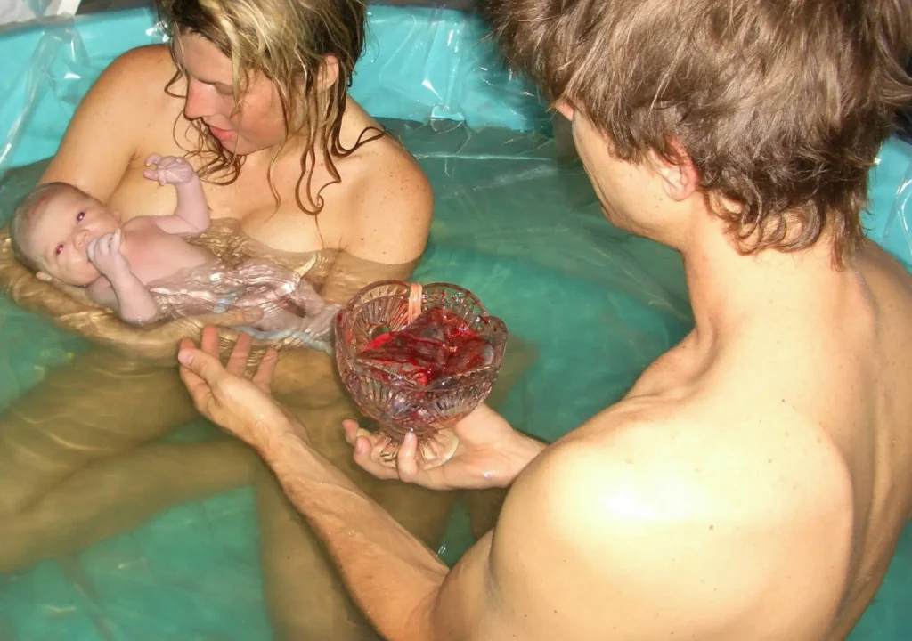 Nach der Geburt wird das Kind kurz unter Wasser bleiben, bevor es auf die Brust der Mutter gelegt wird. Die eigenständige Atmung des Kindes beginnt erst nach dem Kontakt mit der kühleren Luft an der Oberfläche. Die Mutter und das Kind bleiben im Wasser, bis die Plazenta geboren ist.