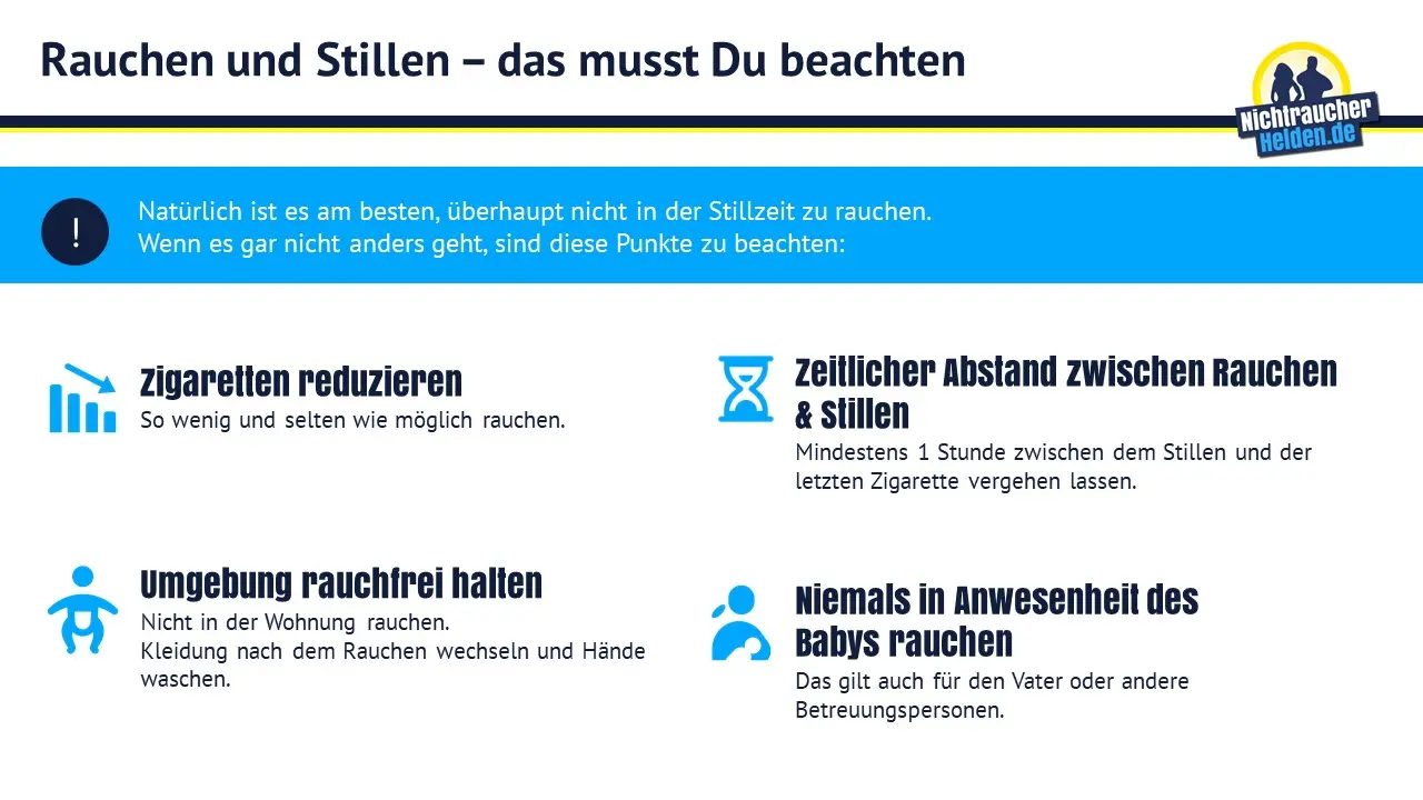 - Verhaltensstörungen : Es gibt Hinweise darauf, dass Rauchen in der Stillzeit zu Verhaltensstörungen beim Kind führen kann.