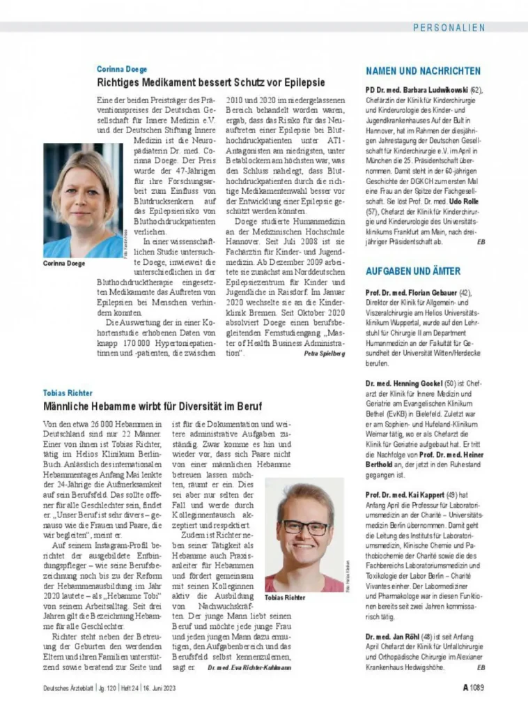 In Deutschland gibt es etwa 2000 Hebammen, von denen nur 22 Männer sind. Einer von ihnen ist Tobias Richter, der im Helios Klinikum Berlin-Buch arbeitet. Er ist ein Beispiel dafür, dass der Beruf der Hebamme offen für alle Geschlechter ist. Richter ist seit 2018 examinierte Hebamme und betreut werdende Eltern und ihre Familien während der Schwangerschaft, Geburt und im Wochenbett.