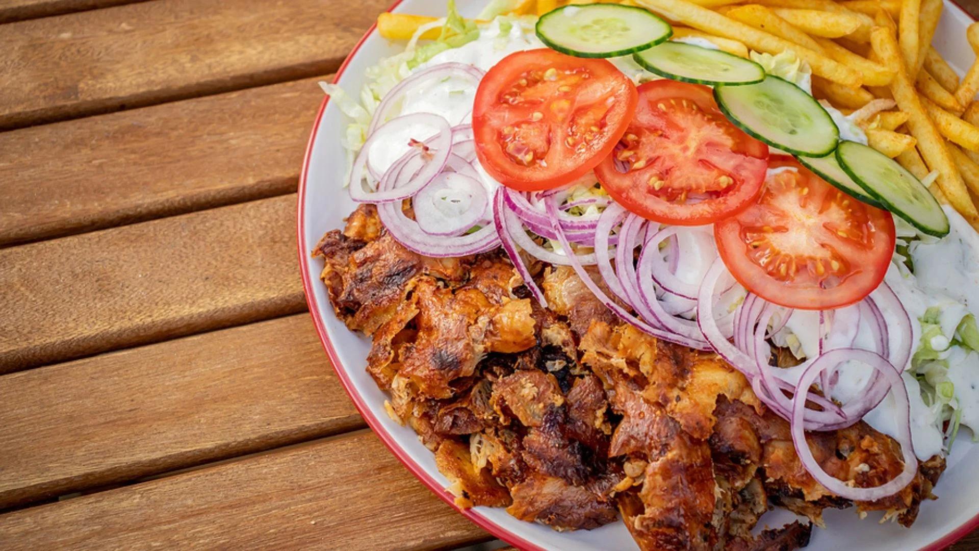 • Gemüse-Gyros: Gegrilltes Gemüse mit Tzatziki-Soße und Reis