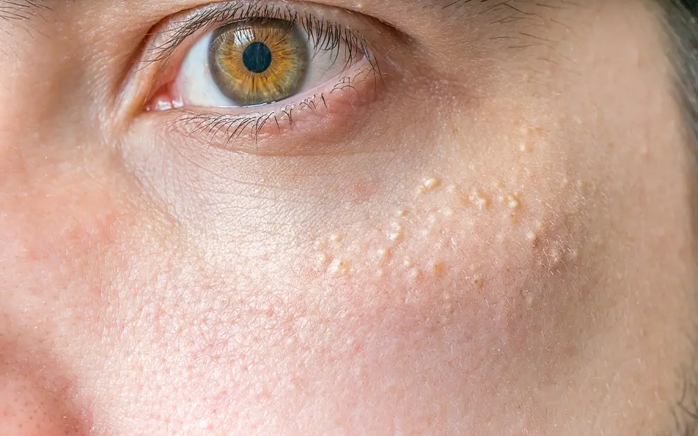 Grieskörnchen sind kleine, weiße oder gelbliche Knötchen, die sich in der obersten Hautschicht (Epidermis) bilden. Sie entstehen durch Verstopfung der Talgdrüsen, die normalerweise das Hautfett produzieren. Dieses Fett kann sich in den Drüsen ansammeln und kleine Knoten bilden. Die meisten Grieskörnchen sind harmlos und verursachen keine Schmerzen oder Beschwerden. Sie können jedoch ästhetisch störend sein, insbesondere im Bereich um die Augen herum.