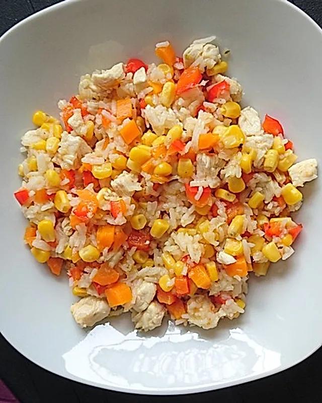 Zutaten: 1 Hähnchenbrustfilet, in kleine Würfel geschnitten 1 rote Paprika, in Würfel geschnitten 1 gelbe Paprika, in Würfel geschnitten 1 Zucchini, in Würfel geschnitten 1 EL Olivenöl Zubereitung: Die Hähnchenwürfel mit dem Olivenöl marinieren.Die Hähnchenwürfel, die Paprikawürfel und die Zucchiniwürfel abwechselnd auf Spieße stecken.Die Spieße bei mittlerer Hitze in einer Pfanne braten, bis das Hähnchen gar ist.