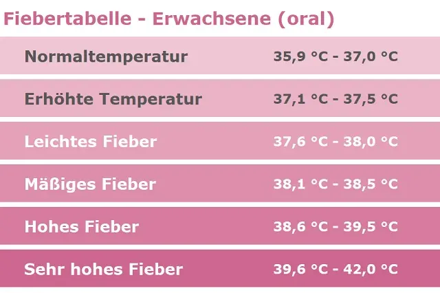 Fieber ist eine erhöhte Körpertemperatur, die über dem normalen Bereich liegt. Bei gesunden Kindern liegt die normale Körpertemperatur zwischen 36,5° und 37,5° Celsius. Liegt die Temperatur zwischen 37,6 und 38,5° Celsius, hat das Kind erhöhte Temperatur. Ab 38,5° Celsius spricht man von Fieber, über 39,5° Celsius hat das Kind hohes Fieber.