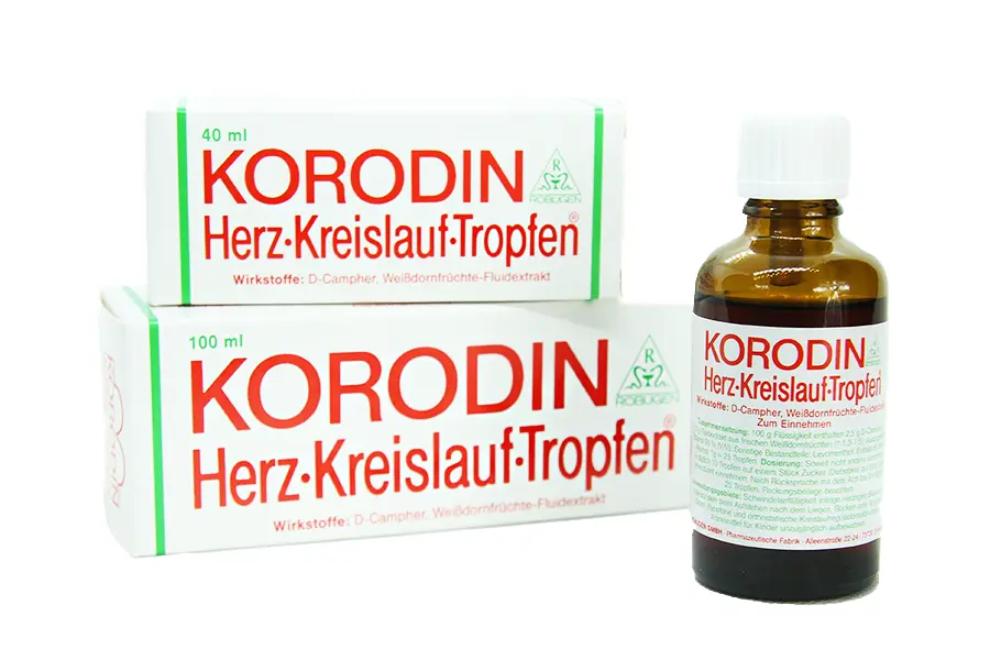 Korodin Tropfen sind ein pflanzliches Arzneimittel, das hauptsächlich aus Weißdornbeerextrakten und D-Campher besteht. Es wird zur Behandlung von vegetativ-funktionellen Herz-Kreislauf-Beschwerden wie hypotone und orthostatische Kreislaufstörungen eingesetzt. Korodin Tropfen können auch zur unterstützenden Behandlung bei nachlassender Leistungsfähigkeit des Herzens, entsprechend Stadium II nach NYHA, verwendet werden.