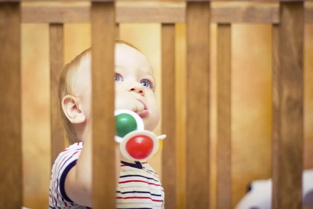 • Gitterstäbe: Der Abstand zwischen den Gitterstäben sollte mindestens 4,5 cm und maximal 6,5 cm betragen, um zu verhindern, dass das Kind seinen Kopf zwischen den Stäben hindurchstecken kann.