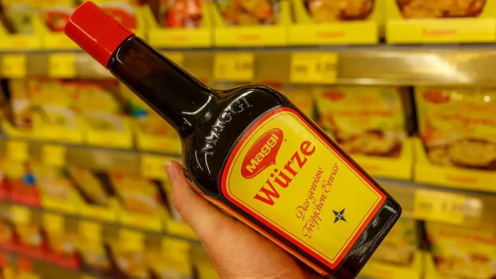 Maggi ist eine flüssige Würzsauce, die in Deutschland sehr beliebt ist. Sie wird aus pflanzlichen Proteinen, Wasser, Aromen, Geschmacksverstärkern, Salz und Zucker hergestellt. Maggi ist vegan und kann zum Würzen von Suppen, Soßen und anderen Gerichten verwendet werden.