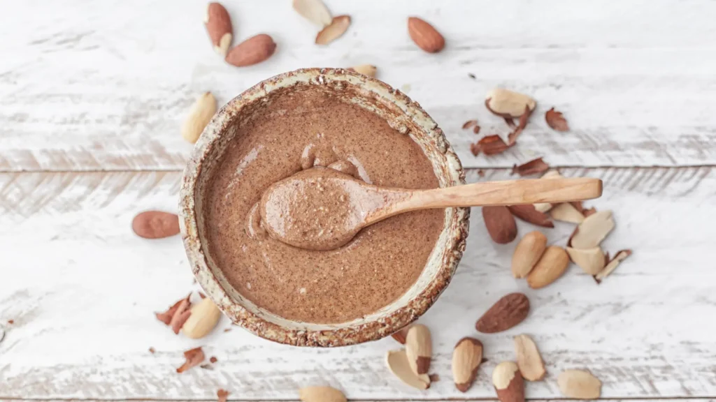 Braunes Mandelmus wird aus gerösteten Mandeln hergestellt und hat einen intensiven, nussigen Geschmack. Es enthält mehr Antioxidantien als weißes Mandelmus und ist daher eine gute Wahl für Schwangere.