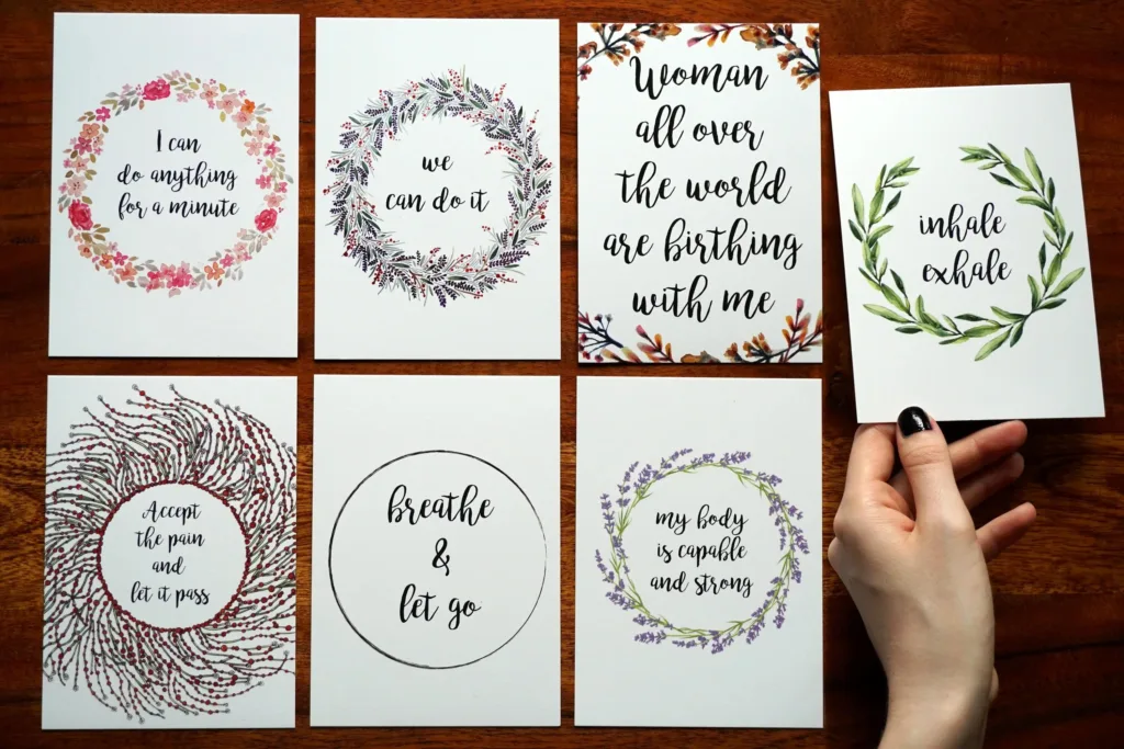 Sie können Ihr Mantra auf verschiedene Weise während der Geburt verwenden. Sie können es laut oder leise wiederholen, es in Ihrem Kopf denken oder es auf einer Karte schreiben und während der Wehen ansehen. Es gibt keine richtige oder falsche Methode. Wählen Sie die Methode, die Ihnen am besten hilft, sich zu entspannen und sich auf den Geburtsprozess zu konzentrieren.