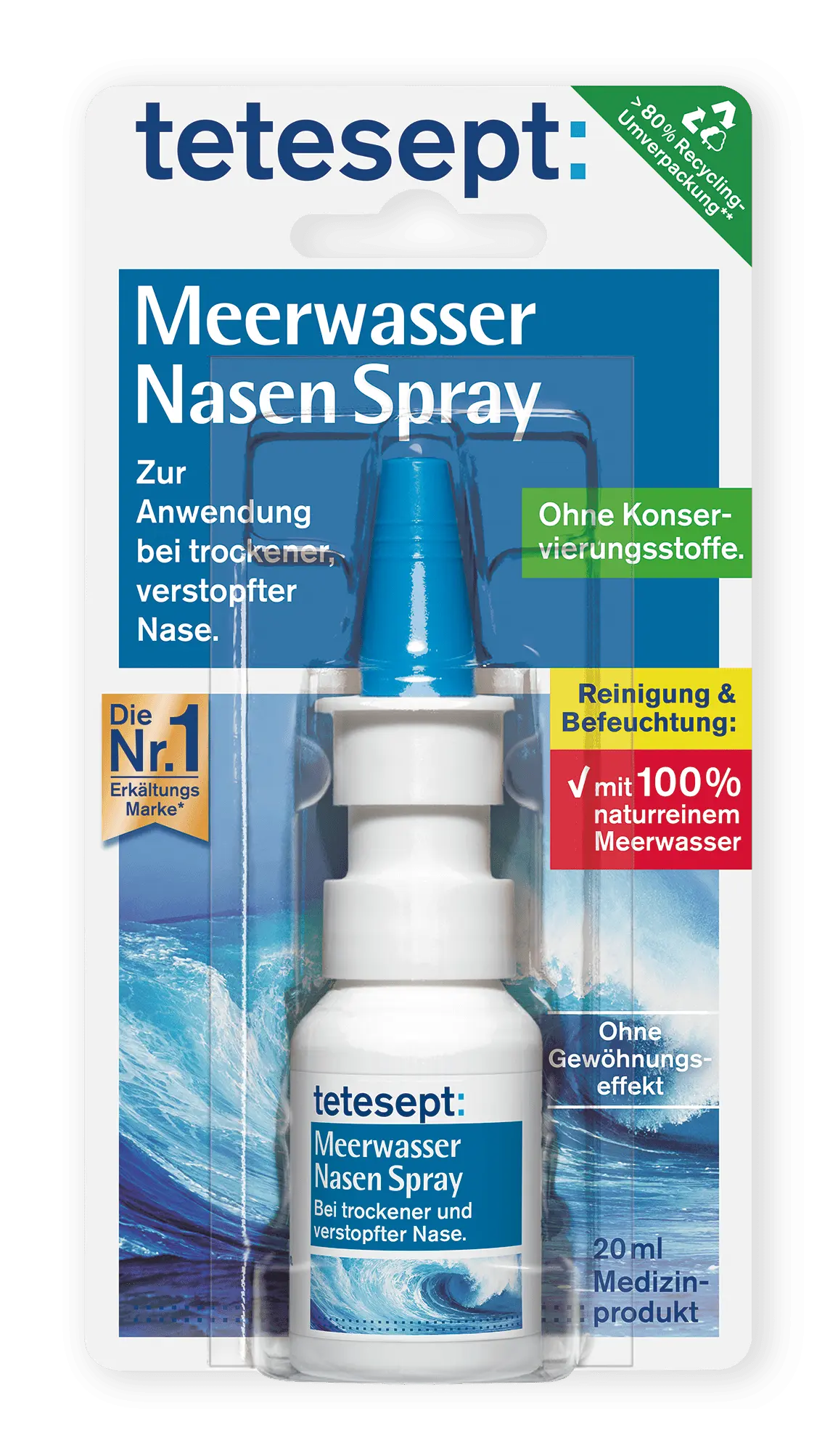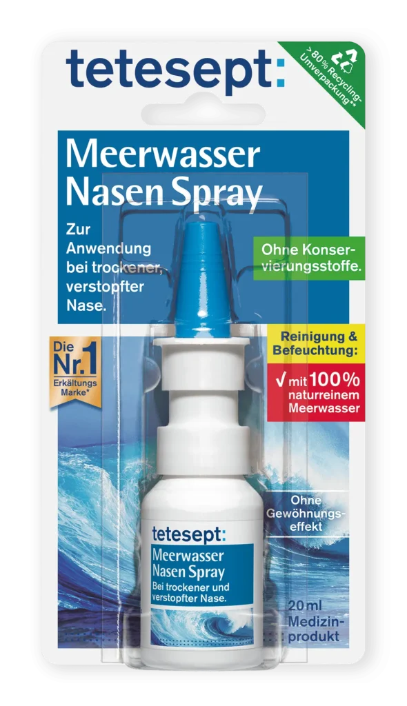 Meerwasser Nasenspray ist ein Nasenspray, das eine isotonische Lösung aus sterilisiertem Meerwasser enthÀlt. Es ist frei von Konservierungsstoffen und anderen Zusatzstoffen und wird daher als besonders vertrÀglich angesehen. Die isotonische Lösung hat die gleiche Salzkonzentration wie die Nasenschleimhaut, wodurch es die Schleimhaut weder austrocknet noch reizt.