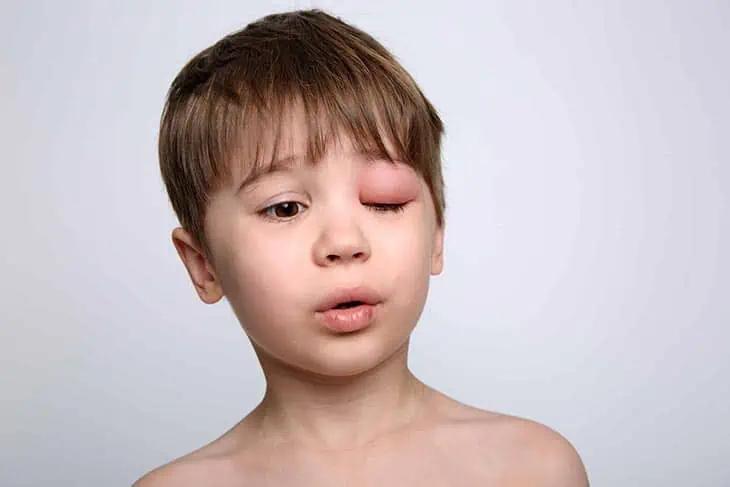 Am Auge ist die Entzündung besonders unangenehm, da die Haut sehr empfindlich ist. Die Schwellung kann so stark sein, dass das Auge fast vollständig zugeschwollen ist. Auch die Bewegung des Auges kann eingeschränkt sein.