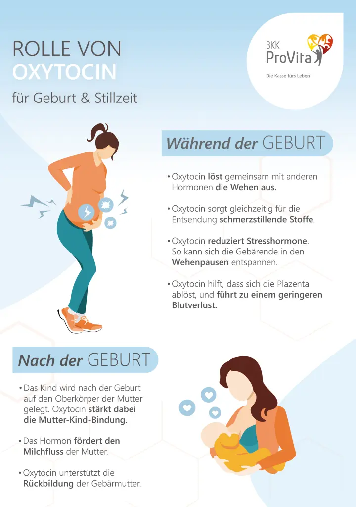 - Kontraktion der Gebärmutter: Oxytocin hilft, die Gebärmutter nach der Geburt zusammenzuziehen und so das Risiko von Blutungen zu verringern.