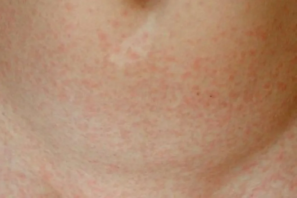 - Rote, fein punktierte Hautveränderungen (Ausschlag)
