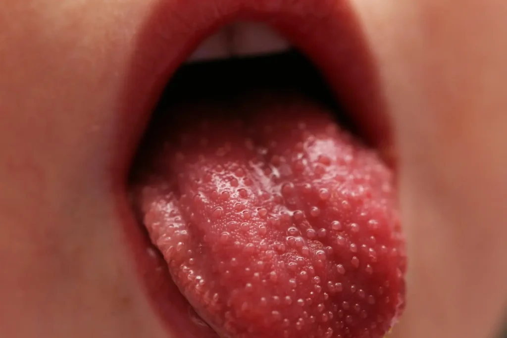 - Erdbeerzunge (rote, leicht geschwollene Zunge mit weißen Belägen)