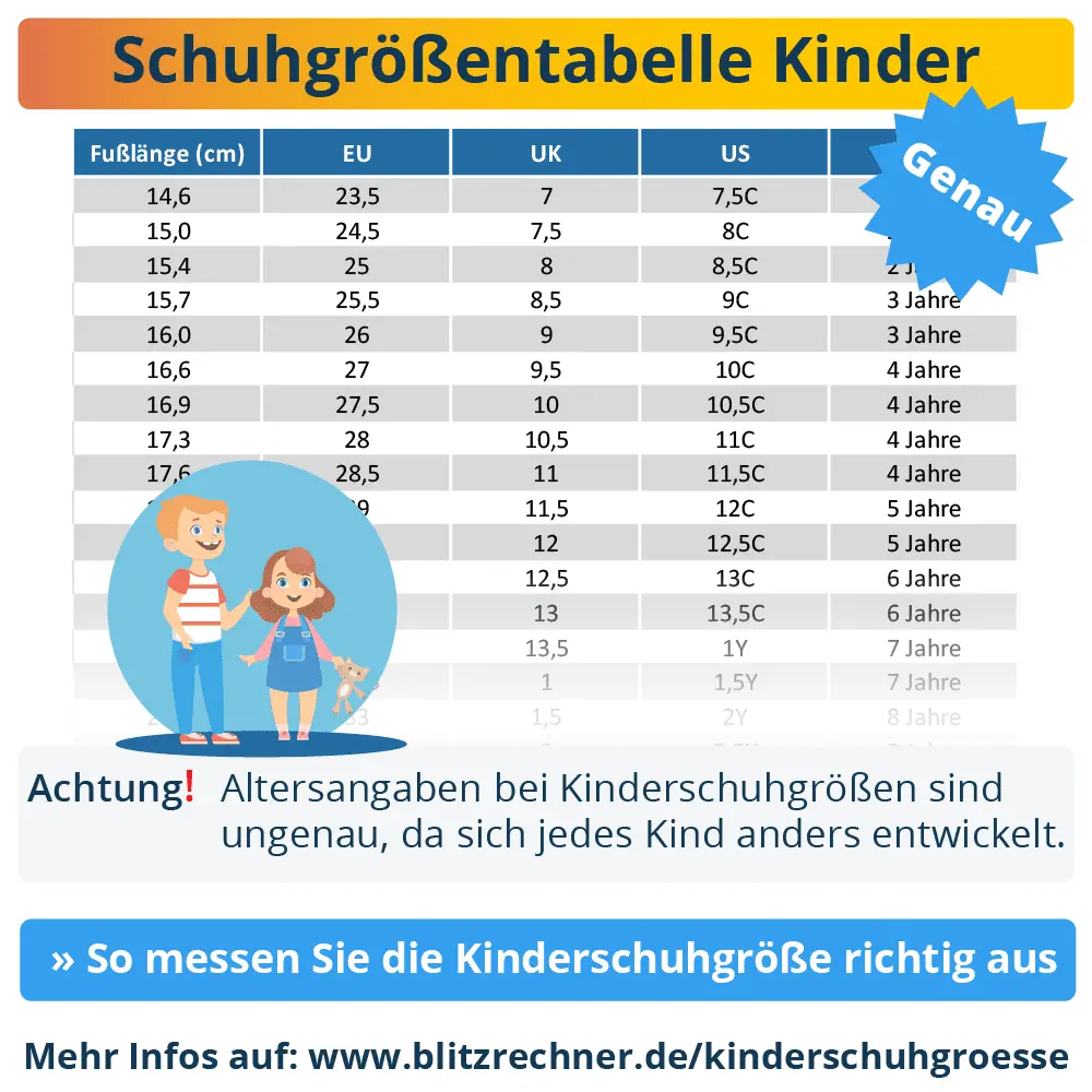 Viele Schuhhersteller bieten Größentabellen an, die die entsprechende Schuhgröße zu einer bestimmten Fußlänge angeben. Diese Tabellen dienen als Orientierungshilfe, berücksichtigen jedoch nicht immer den individuellen Fußbau Ihres Kindes.