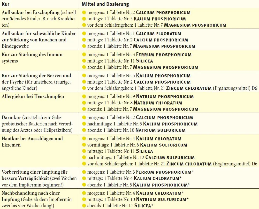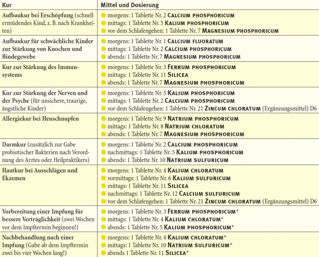 | Nr. 2 | Calcium phosphoricum | Wachstum und Entwicklung, Knochenwachstum, Müdigkeit, Konzentrationsschwierigkeiten |