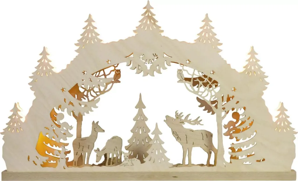 Vor allem Rehe, Vögel und Hasen werden häufig auf Schwibbögen mit traditionellen Motiven dargestellt. Sie symbolisieren die Natur des Erzgebirges und seine unberührte Schönheit. Die Tiere stehen für die Ruhe und Beschaulichkeit der Weihnachtszeit und erinnern an die Schönheit der Natur.