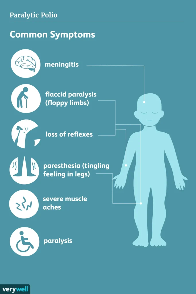 Etwa 1 % der Menschen, die sich mit dem Poliomyelitis-Virus infizieren, entwickeln eine paralytische Form der Krankheit. Diese Form der Poliomyelitis kann zu einer Lähmung der Muskeln führen, insbesondere in den Beinen und Füßen. Weitere Symptome der paralytischen Poliomyelitis sind: