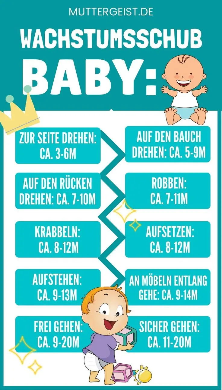 - Neue Fähigkeiten: Ihr Baby könnte plötzlich neue Fähigkeiten entwickeln, wie zum Beispiel sich drehen, krabbeln oder sitzen. Wachstumsschübe gehen oft mit einer Entwicklung neuer Fähigkeiten einher.