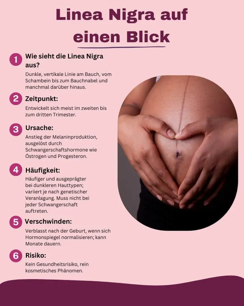 Die Linea Nigra, auch bekannt als Schwangerschaftsstreifen, ist eine dunkle Linie, die sich in der Mitte des Bauches von der Schambeinregion bis zum Bauchnabel erstreckt. Sie entsteht durch eine erhöhte Produktion des Hormons Melanin, das für die Pigmentierung der Haut verantwortlich ist. Während der Schwangerschaft werden die Melanozyten, die Zellen, die Melanin produzieren, durch die Hormone stimuliert, was zu einer verstärkten Pigmentierung führt. Die Linea Nigra ist in der Regel bei Frauen mit dunklerer Hautfarbe deutlicher sichtbar.