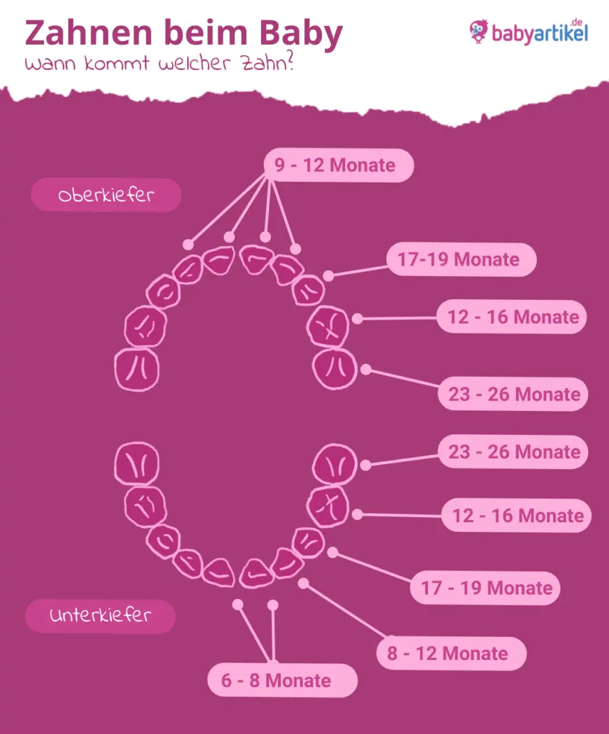 Babys bekommen normalerweise 20 Milchzähne. Die ersten Zähne brechen in der Regel im Alter von 6-8 Monaten durch. Die letzten Milchzähne kommen im Alter von 2-3 Jahren.
