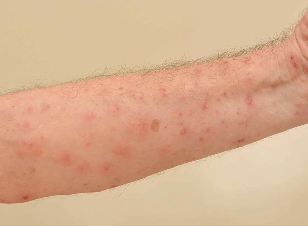 Die Symptome von Krätze können mehrere Wochen nach der Behandlung anhalten. Der Juckreiz kann auch nach der Behandlung noch einige Wochen lang bestehen bleiben.