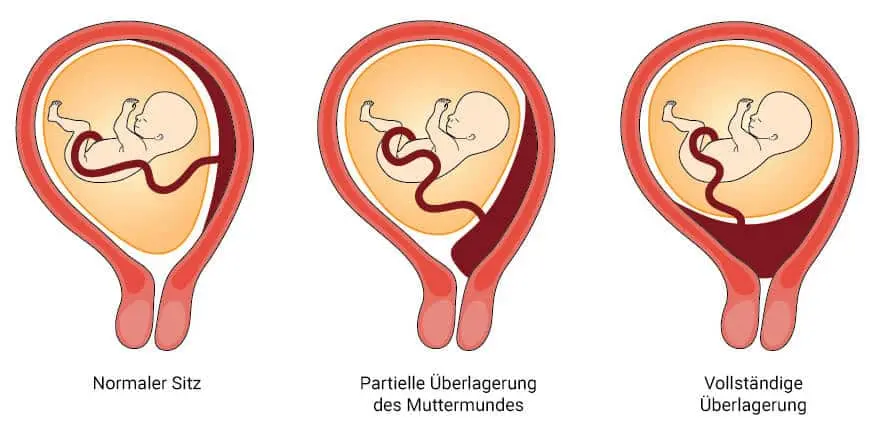 - Plazenta praevia totalis: Die Plazenta bedeckt den gesamten Gebärmutterhals.